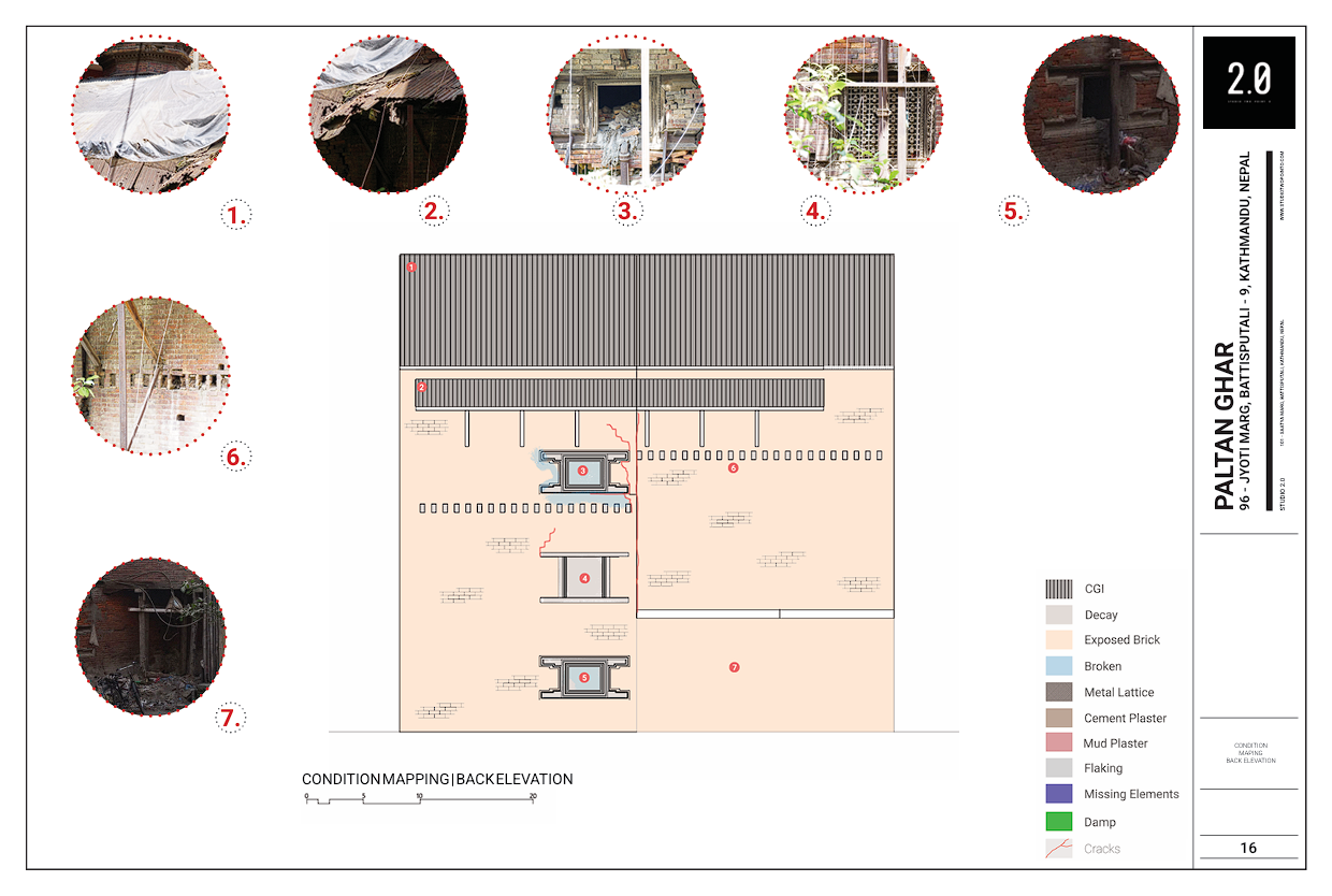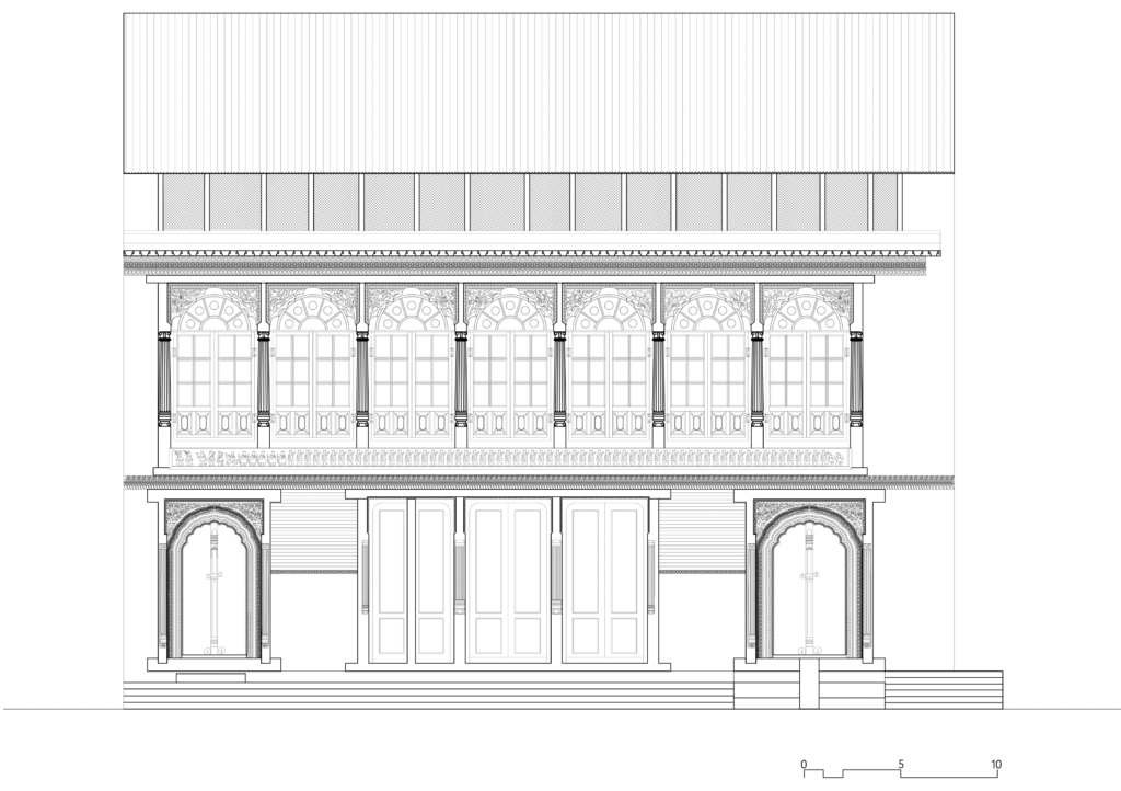 The building contains 2 exposed facades, one to the front and another at the back facing the courtyard. This 3.5 storied building has 3 roof styles on top and a elaborate window ribbon with intricate details across the front elevation. contains one wooden staircase in each floor for upper access and 3 Newari styled windows, 1 in each floor in the back elevation.
